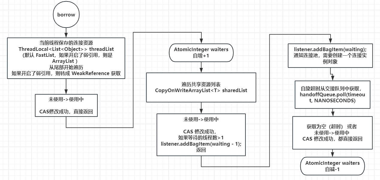 采用了 queue-stealing 的机制获取元素:首先尝试从 ThreadLocal 中获取属于当前线程的元素来避免锁竞争,如果没有可用元素则再从共享的 CopyOnWriteArrayList 中获取。此外,ThreadLocal 和 CopyOnWriteArrayList 在 ConcurrentBag 中都是成员变量,线程间不共享,避免了伪共享(false sharing)的发生。同时因为线程本地存储中的连接是可以被其他线程窃取的,在共享队列中获取空闲连接,所以需要用 CAS 方法防止重复分配。