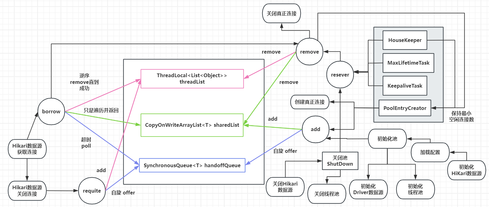 最核心的类,真正的连接池。是一个封装的并发管理工具,负责管理池化资源,不仅仅是数据库连接,其他池化资源都可以通过它来管理。它是一个 lock-free 集合,在连接池(多线程数据交互)的实现上具有比 LinkedBlockingQueue 和 LinkedTransferQueue 更优越的并发读写性能。