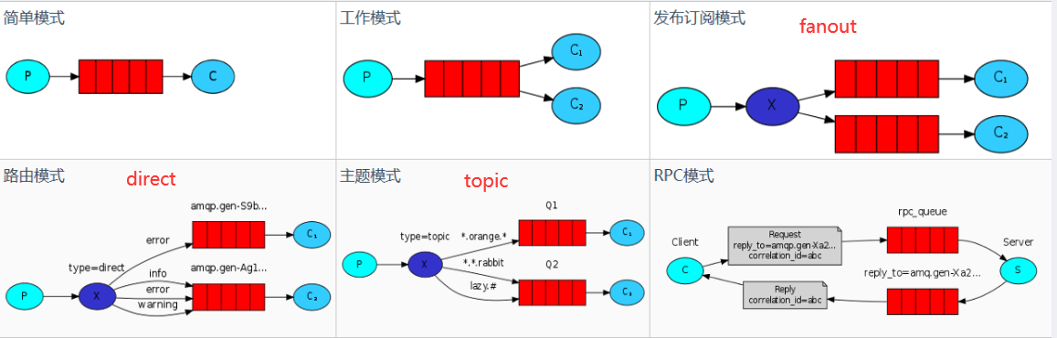 注意:上图中简单模式和工作模式虽然没有画出交换机,但是都会有一个默认的交换机,类型为direct