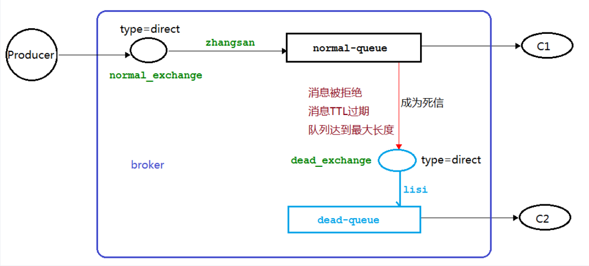 消息被拒绝(basic.reject 或 basic.nack)并且 requeue=false